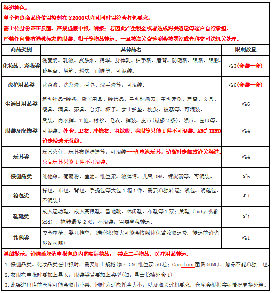 · 请如实申报,单个包裹价值不超过2000元,如超出价值以及内件限制的,需更换其他线路,具体打包规则请参考下表: