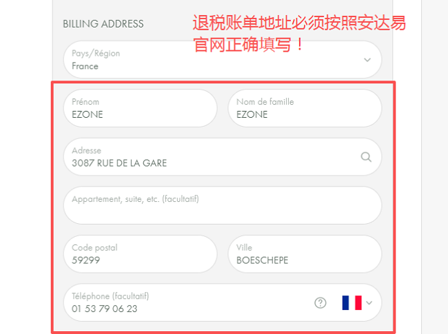 注意:prenom=名 nom=姓,下单时这两项必须完全复制粘贴进收货信息--Adresse de livraison,退税发票信息写进账单地址--Adresse de facturation(决定是否能退税)