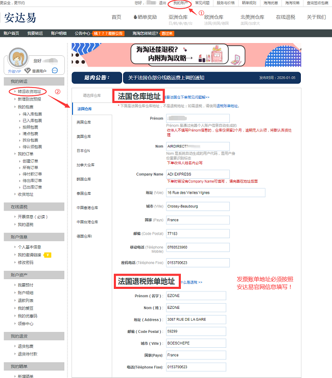 注册安达易并完善信息--我的账户--我的转运--转运收货地址--查看仓库地址和发票地址