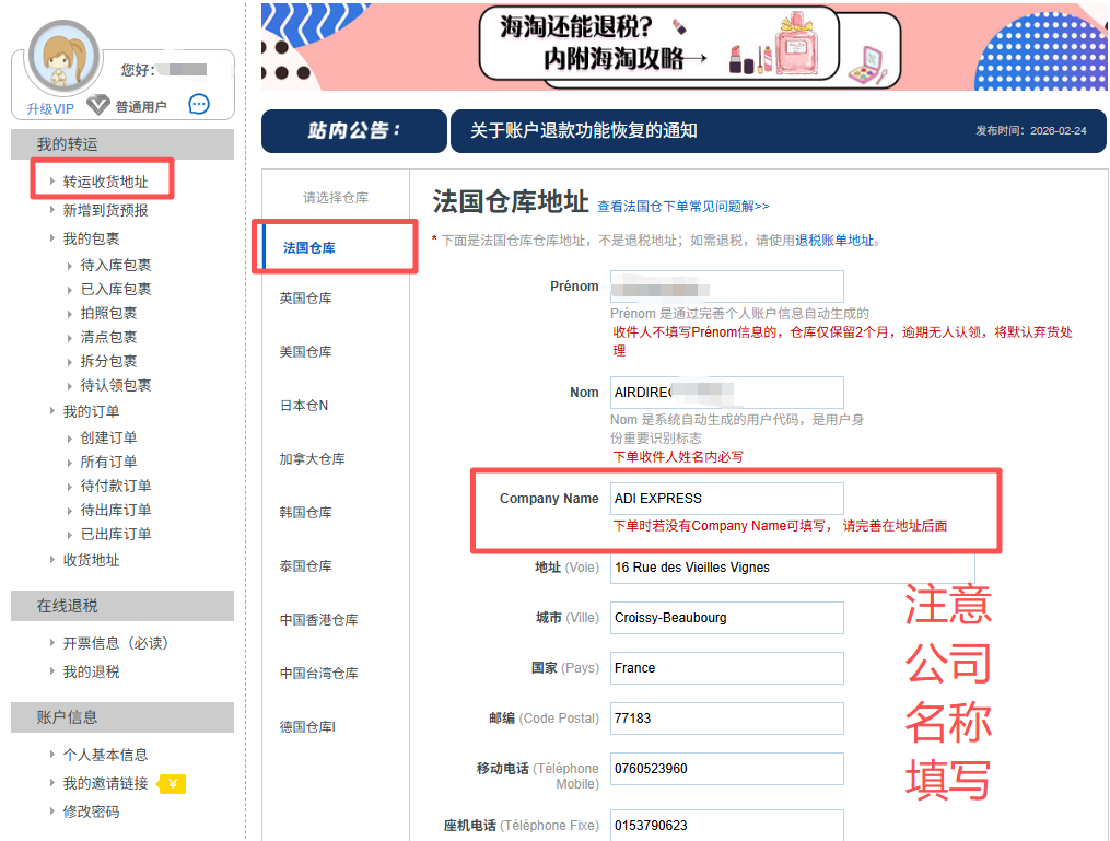 详情可移步 我的账户--我的转运--转运收货地址--法国仓库>>(如需退税,请留意下方账单地址的变化)请务必注意,不只是法国仓收货地址更新,接退税公司通知,退税账单地址也有变更!以安达易系统最新展示为准,请及时调整您在各大电商网站保存的历史账单地址信息,以免给您造成不便!