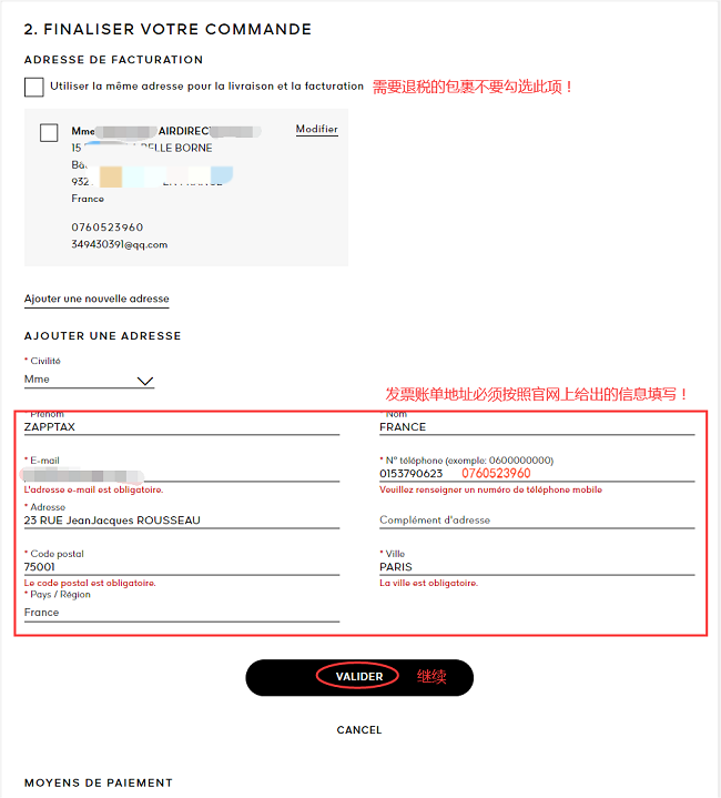 电商下单时分别填写收货地址和退税发票地址,退税包裹需要完全按照我们给出的退税发票地址和姓名填写!