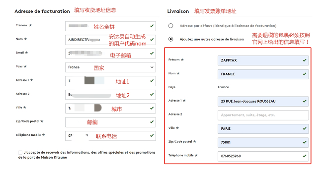电商下单时分别填写收货地址和退税发票地址,退税包裹需要完全按照我们给出的退税发票地址和姓名填写!